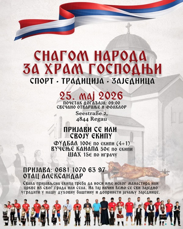 Srpska pravoslavna crkvena opština Gmunden u Austriji organizuje 25. maja 2026. od 9 časova na adresi Seestraße 2, 4844 Regau jedinstveni dan sporta i tradicije u čast izgradnje Pravoslavne crkve. Svi prihodi idu za ovaj plemeniti cilj.