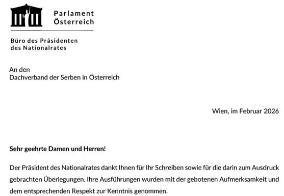 Без обзира на наведено, чини се да је неопходно указати на једну суштинску напомену: функција председника Аустријског парламента по својој природи представља надстраначку, интегративну и на равнотежу усмерену дужност. Она служи представљању саме демократске институције, а не подршци појединачним политичким наративима или међународним конфликтним позицијама. Накнадна политичка тумачења или инструментализација протоколарних или неформалних сусрета – нарочито без знања или сагласности носиоца функције – стога нису у складу са овим институционалним схватањем сопствене улоге и у складу с тим се одбацују.