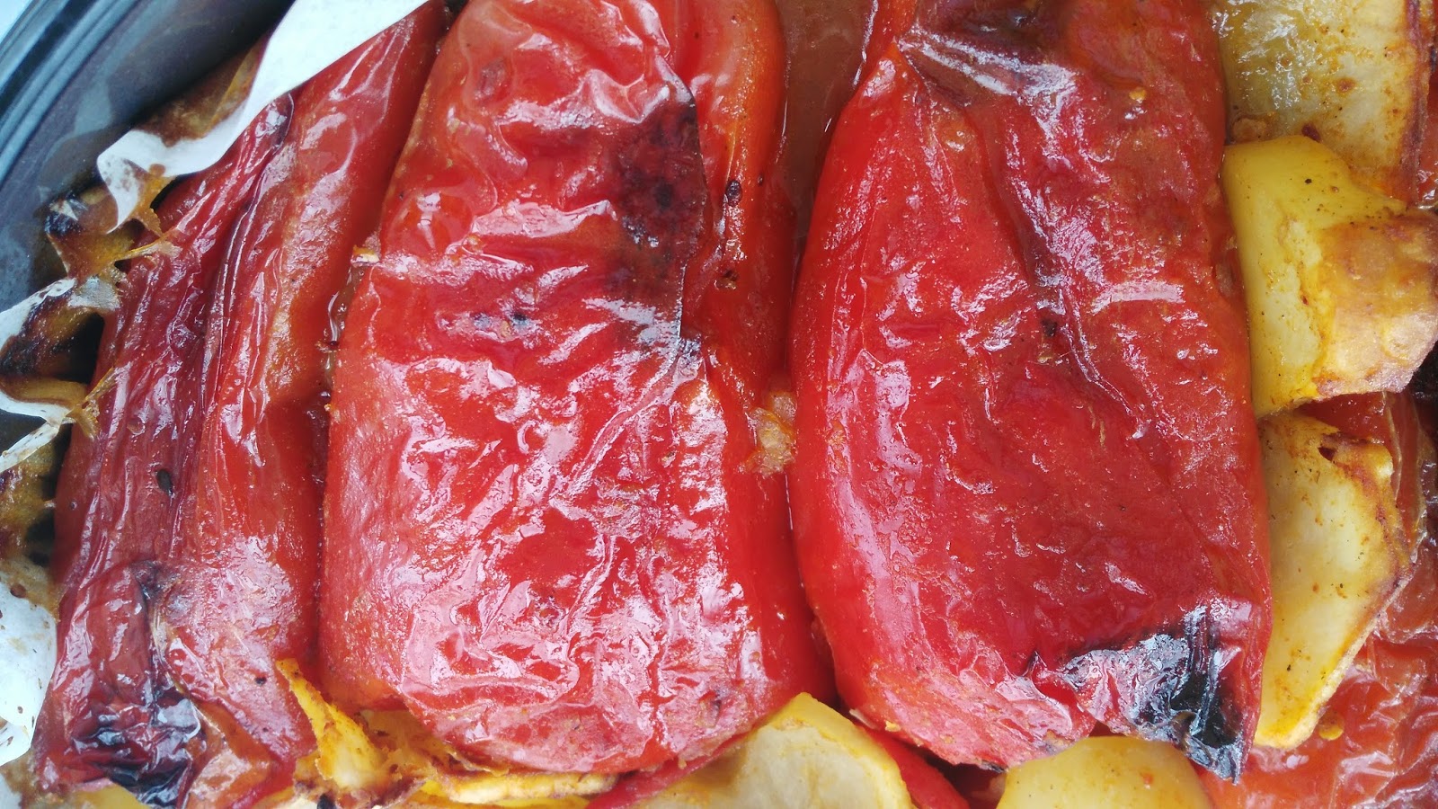 Paprike prelite malo sa uljem i pecite na 200 stepeni C oko 30 mi. da se lepo zapeku Ako je ostalo pasulja sipajte ga u djuveč pa i njega zapecite sa paprikom . Prijatno!