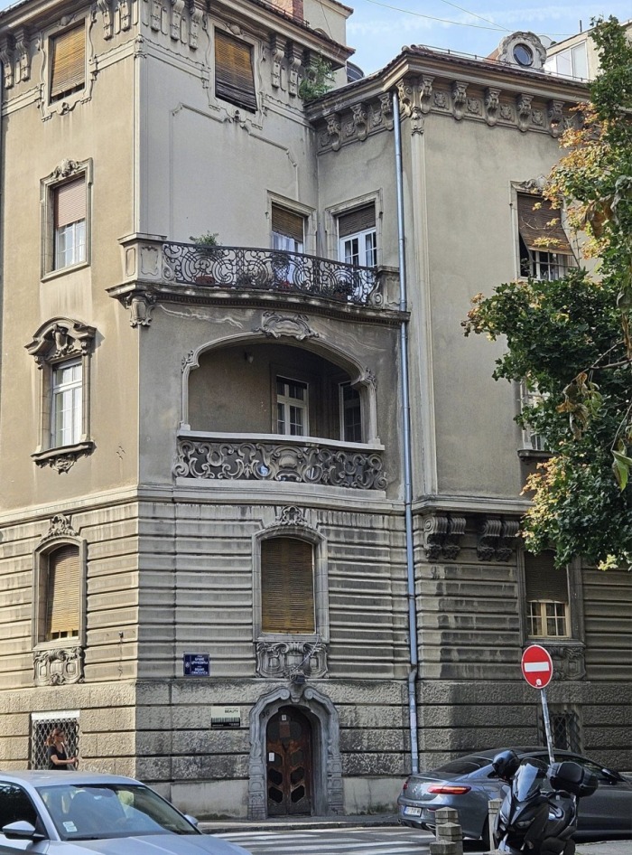 „Zdanje je u obliku nepravilnog ćiriličnog slova P, novija verzija neobaroka, izgrađeno na mestu spajanja 3 ulice, Krušedolske, Svetosavske i Ohridske. Kao naručilac posla naveden je Stamenko Đurović a glavni projektant Dragoslav Radisavljević. U IAB (istorijski arhiv Beograda) na svim planovima je pečat i potpis arhitekte, glavnog projektanta, Leona Talvija. Arhitekta Radisavljević se pominje kao nadzornik. Vlasnik zgrade kao naručilac, ne spominje se Stamenko Đurović već Nikodije i Marika Bogdanović. Nemogućnost sagledavanja celog objekta sa jednog mesta kao i nepostojanje glavne fasade čine ovo neobarokno zdanje nesvakidašnjim. Zdanje predstavlja jedno od retkih arhitektonskih ostvarenja međuratnog beogradskog perioda u kome je ostvarena sinteza unutrašnjeg i spoljašnjeg prostora, dekorativnost ulaznog hola je toliko uočljiva a belina prostora skoro nestvarna”.