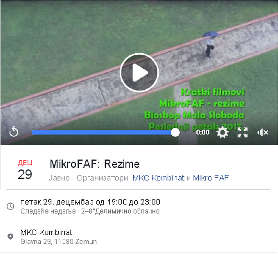 U to ime, pozivamo vas da poslednjeg petka u 2017. godini dođete na Rezime MikroFAF-a u Bioskopu "Mala Sloboda" u 19h, u okiviru kog ćemo kroz uzbudljivu slekciju fimova sumirati osmogodišnju istoriju festivala. Ovo je prva od brojnih MikroFAF večeri u Kombinatu koje vam spremamo, a svi entuzijasti mogu uvek da nam se prključe u koncipiranju i organizovanju daljih programa.