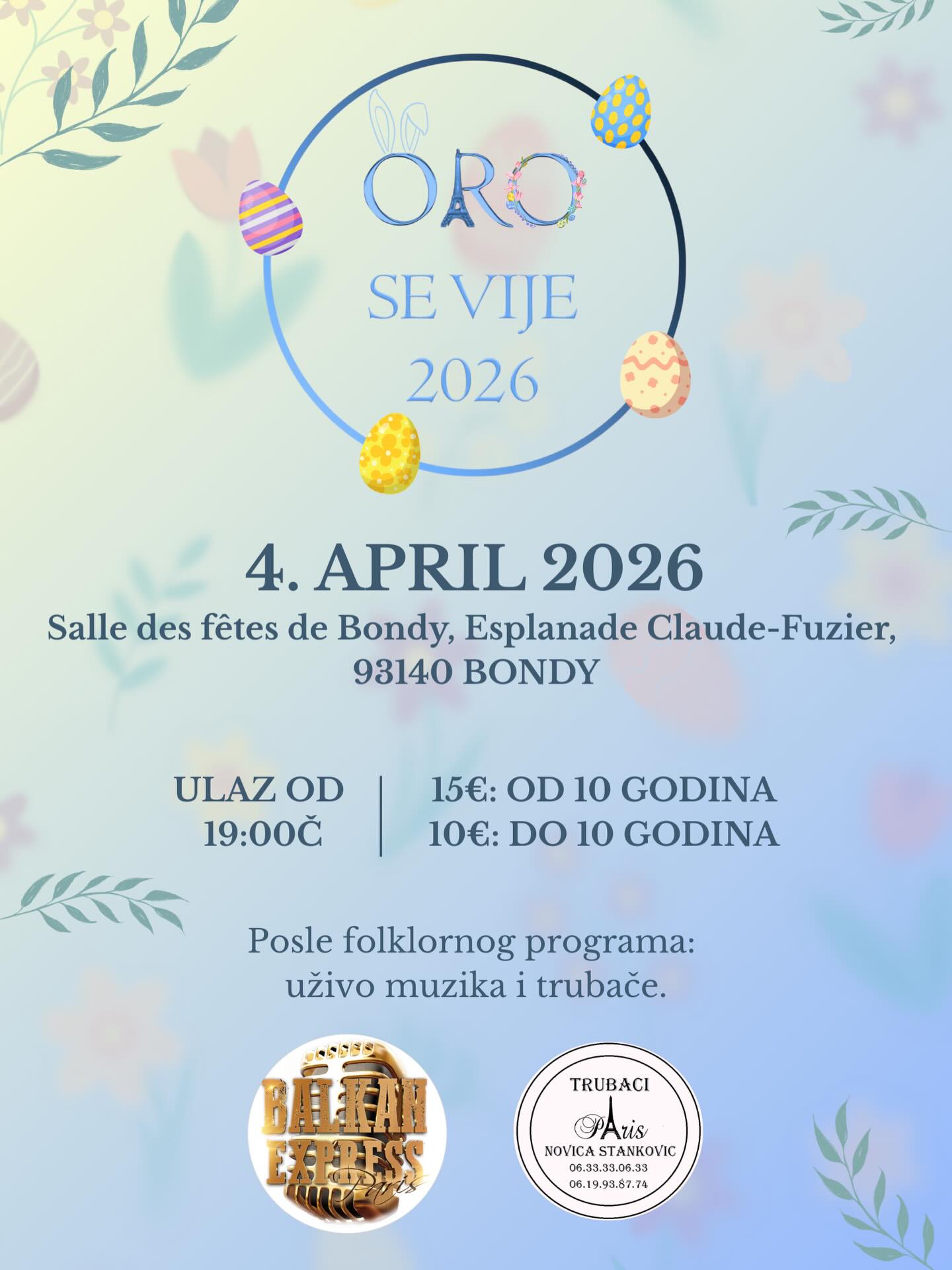 Ansambl Narodnih Igara i Pesama ORO iz okoline Pariza sa ponosom poziva na godišnje okupljanje tradicije, igre i pesme – festival ORO SE VIJE 2026. Goste očekuje bogat program folklora gde se preplitaju igre, pesme i običaji različitih krajeva Balkana i šire.