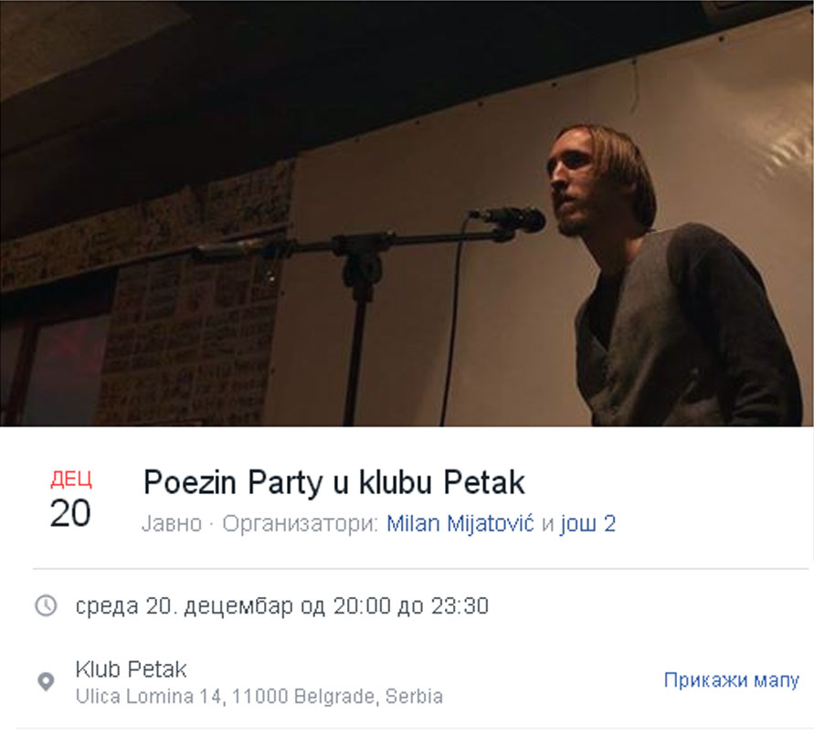Za publiku je ulaz besplatan. Obećavamo odličnu poetsku žurku, dobro druženje i zanimljivu poeziju. Vidimo se na poetskom partiju u klubu Petak!