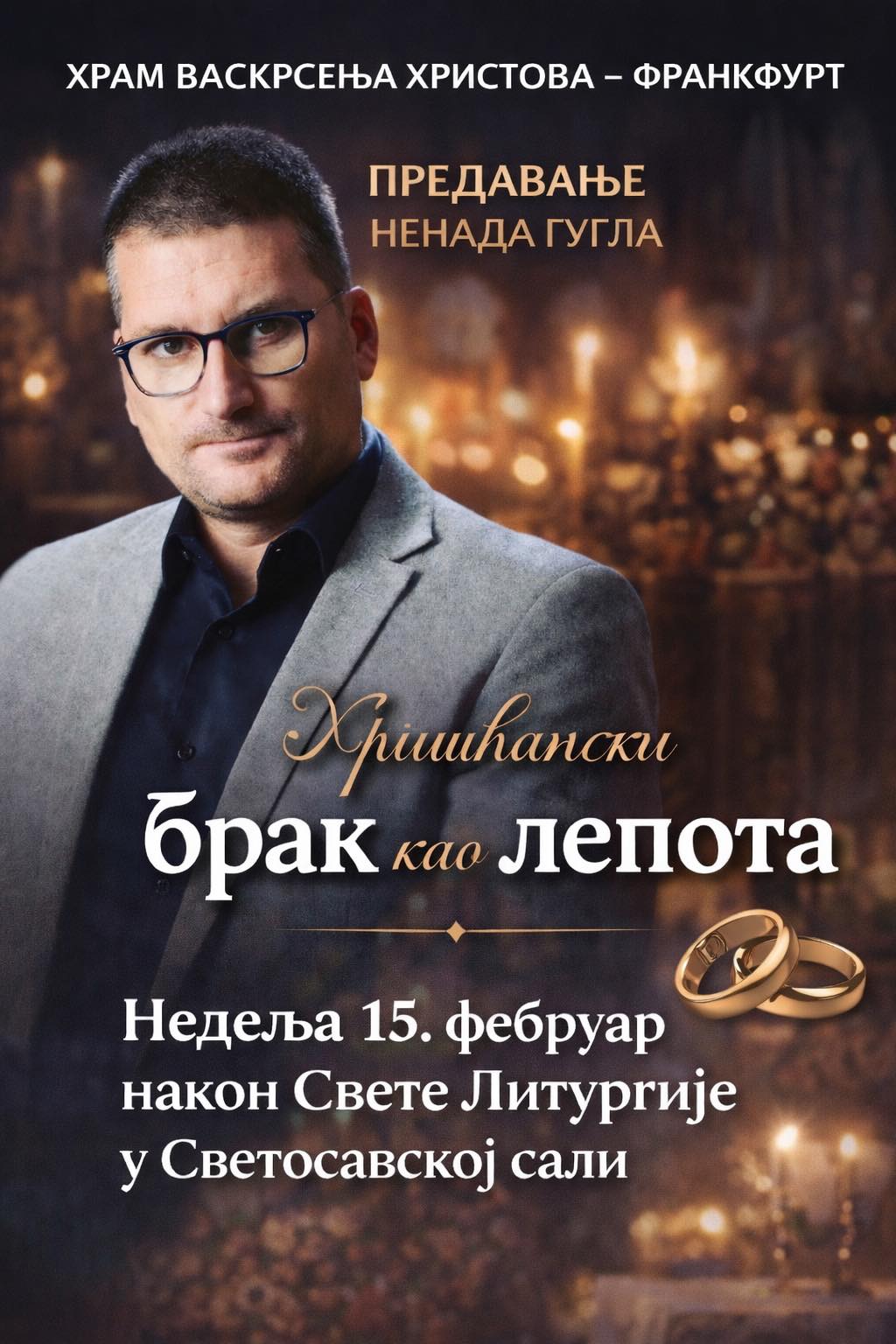 Srpska pravoslavna crkva u Frankfurtu na Majni poziva u nedelju, 15. februara nakon svete liturgije u Svetosavskoj sali hrama Vaskrsenja Hristova na predavanje uvaženog profesora Nenada Gugla. On će govoriti o temi „Hrišćanski brak kao lepota”.