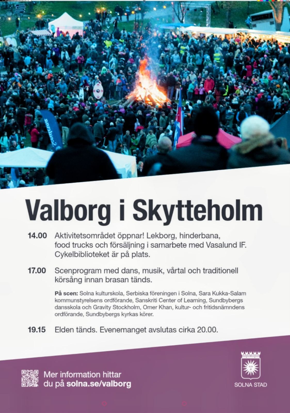 Srpsko udruženje Solna iz Stokholma poziva porodice, prijatelje i sve zainteresovane na zajedničku proslavu dočeka proleća na godišnjoj Valborg večeri u Skiteholmu, u okviru tradicionalnog grada Soln na severu Stokholma. Ovaj događaj udruženje organizuje za zajednicu srpskih iseljenika i švedske susede, kao trenutak susreta, glasa i vatre u zajedničkom gradskom prostoru.