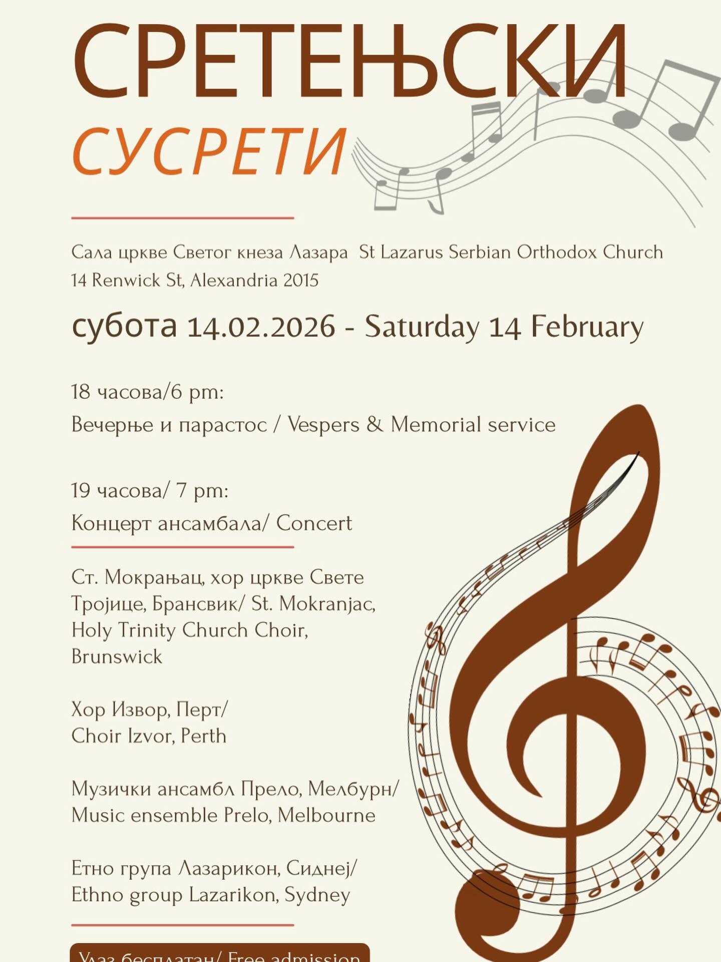 U Sali crkve Svetog kneza Lazara u Sidniju u Australiji, u subotu 14. februara sa početkom u 18 časova će se održati večernja služba i parastos, a postom u 19 časova i koncert.