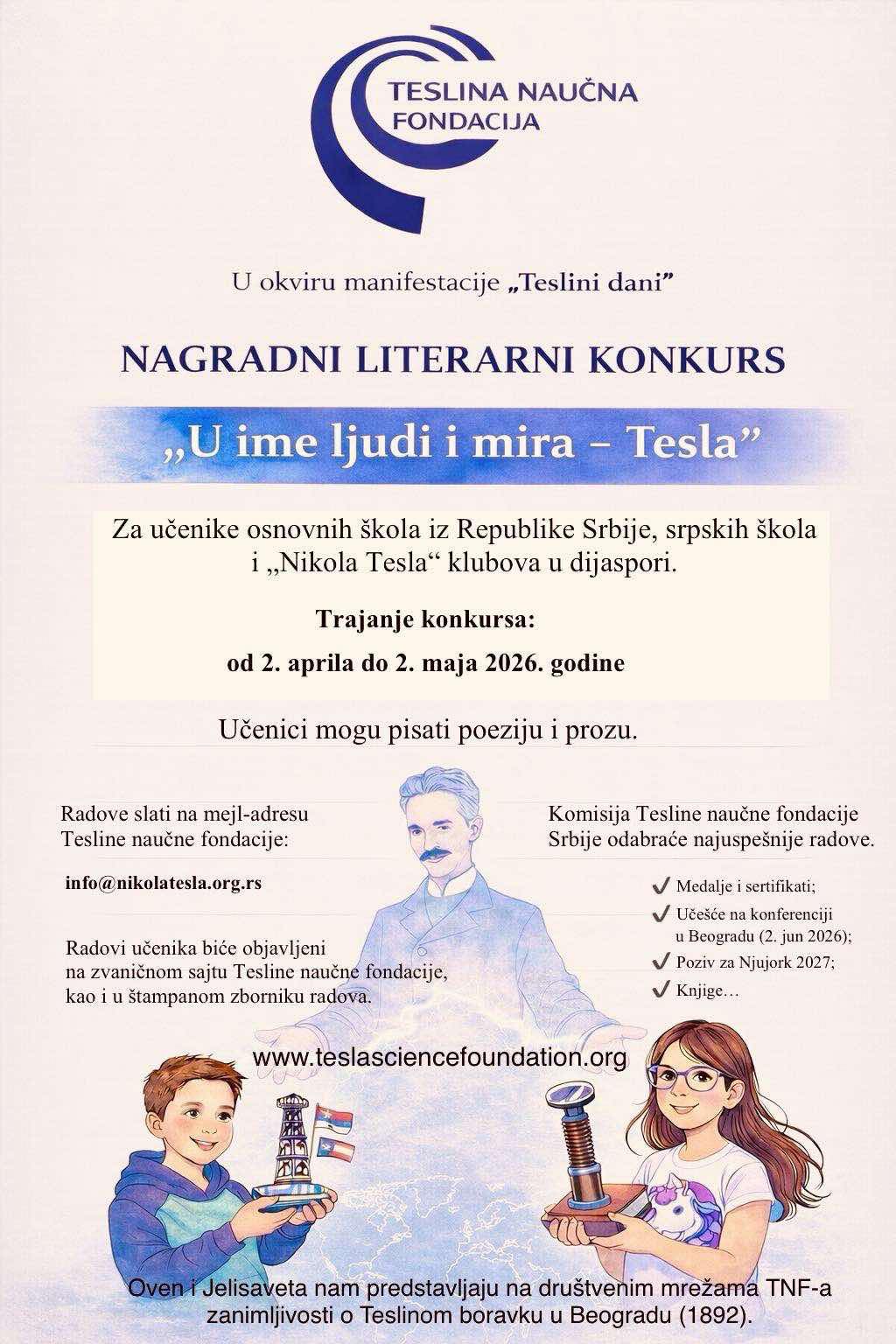 Teslina naučna fondacija Srbije raspisuje nagradni literarni konkurs u okviru tradicionalne manifestacije „Teslini dani” za sve učenike osnovnih škola iz Republike Srbije, srpskih škola i Nikola Tesla klubova u dijaspori.